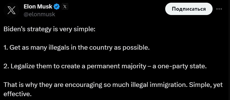 2. Легализовать их, чтобы создать постоянное большинство – однопартийное государство. Вот почему они поощряют так много нелегальной иммиграции. Простой, но эффективный способ", - написал Маск.