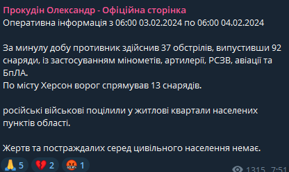 В Херсонской области за минувшие сутки россияне совершили 37 обстрелов, выпустив 92 снаряда, с применением минометов, артиллерии, РСЗО, авиации и БПЛА. По городу Херсон враг направил 13 снарядов.