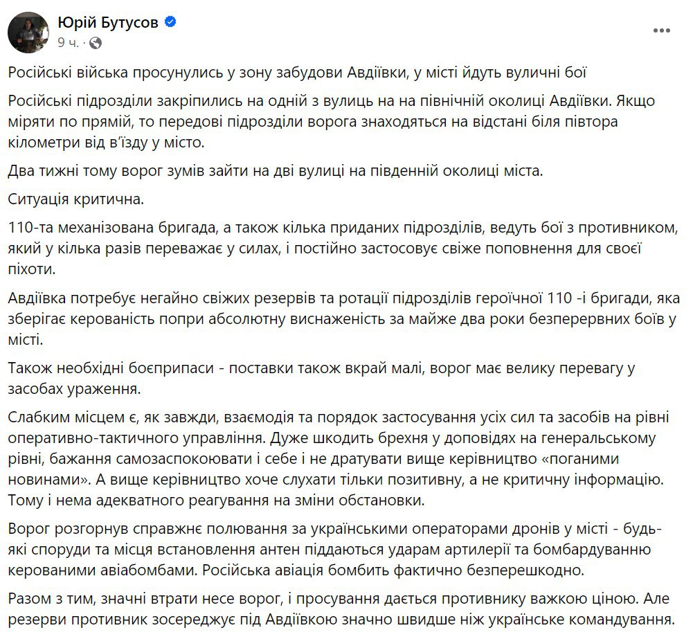 "Если мерить по прямой, то передовые подразделения врага находятся в полутора километрах от въезда в город. Две недели назад враг сумел зайти на две улицы на южной окраине города. Ситуация критическая", - заявил Бутусов.