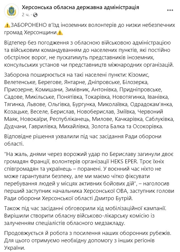 Напомним, ранее в Херсонской области погибли два волонтера-француза.