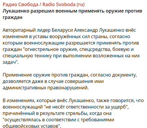 В публикации говорится, что Александр Лукашенко внёс изменения в уставы вооружённых сил страны, согласно которым военнослужащим разрешается применять против граждан "огнестрельное оружие, спецсредства, боевую и специальную технику при выполнении возложенных на них задач".