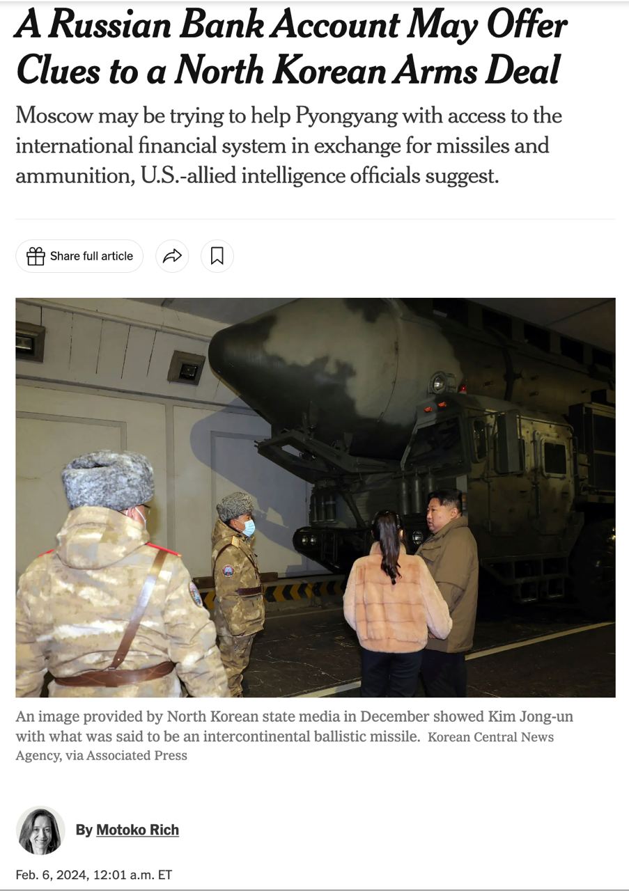 РФ помогает КНДР получить доступ к международной финансовой системе в обмен на боеприпасы - The New York Times