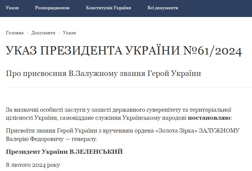 При этом указ датирован вчерашним числом. То есть, он вышел в тот же день, когда Зеленский подписал указ об отставке Залужного с поста главкома ВСУ. Но на сайте президента указ о награждении появился только сегодня.