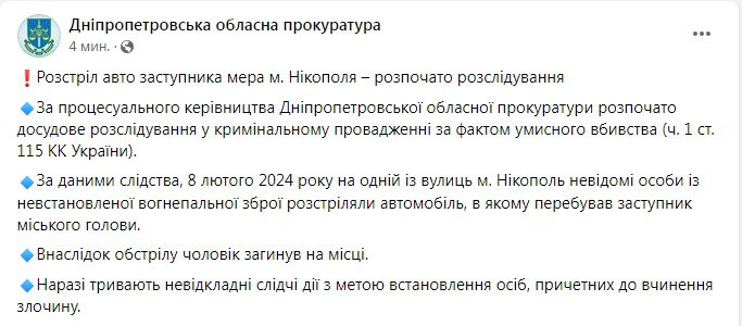 "По данным следствия, 8 февраля на одной из улиц Никополя неизвестные из неустановленного огнестрельного оружия расстреляли автомобиль, в котором находился заместитель городского главы", - сказано в публикации ведомства.
