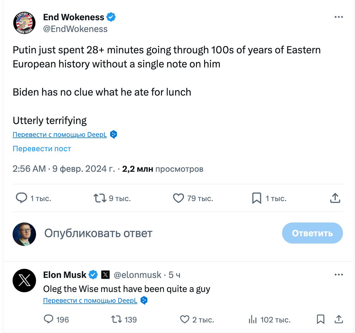 Американский миллиардер Илон Маск прокомментировал интервью президента РФ Владимира Путина журналисту Такеру Карлсону.