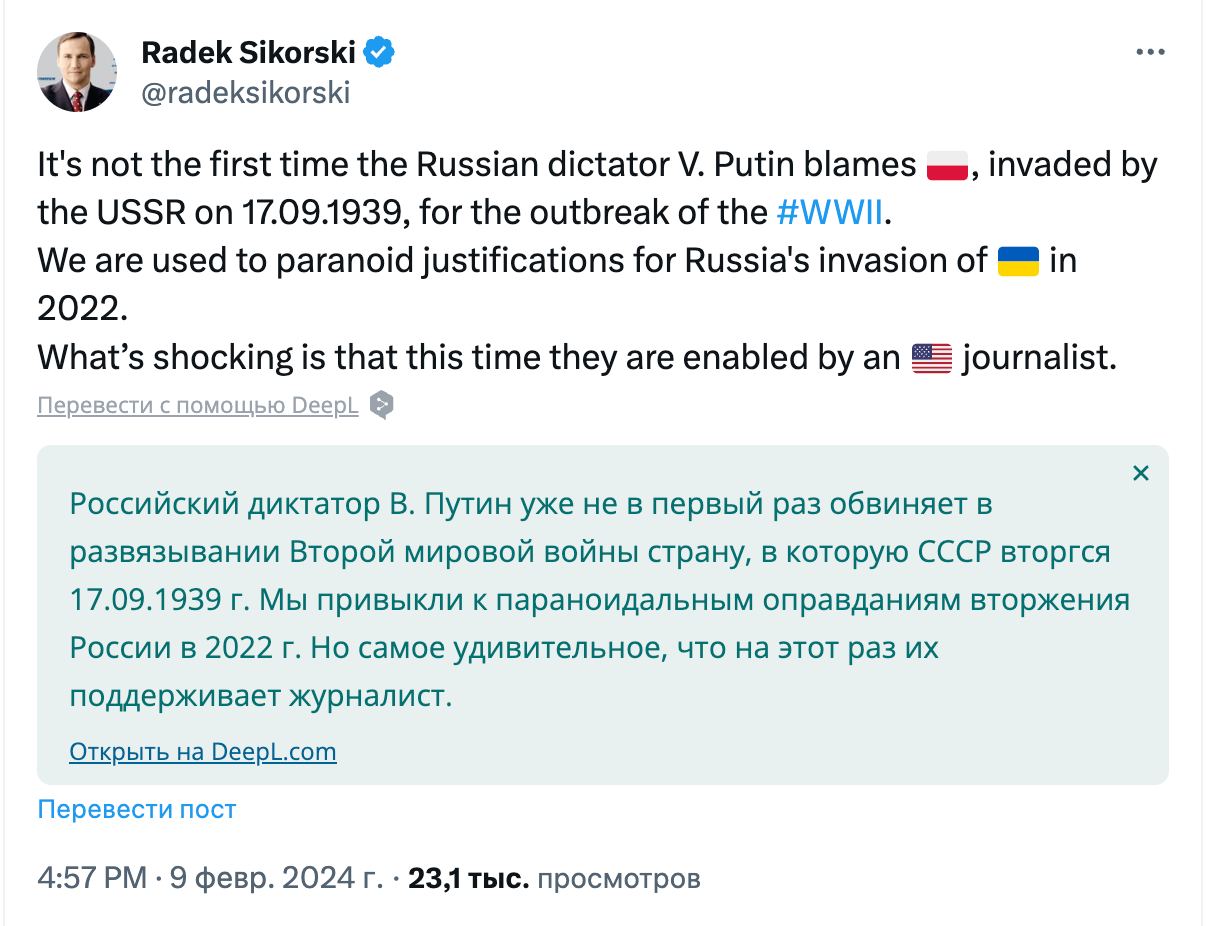 "Российский диктатор В. Путин уже не в первый раз обвиняет в развязывании Второй мировой войны страну, в которую СССР вторгся 17.09.1939 г. Мы привыкли к параноидальным оправданиям вторжения России в 2022 г. Но самое удивительное, что на этот раз их поддерживает журналист", – написал министр иностранных дел Польши Радослав Сикорский в соцсети Х.