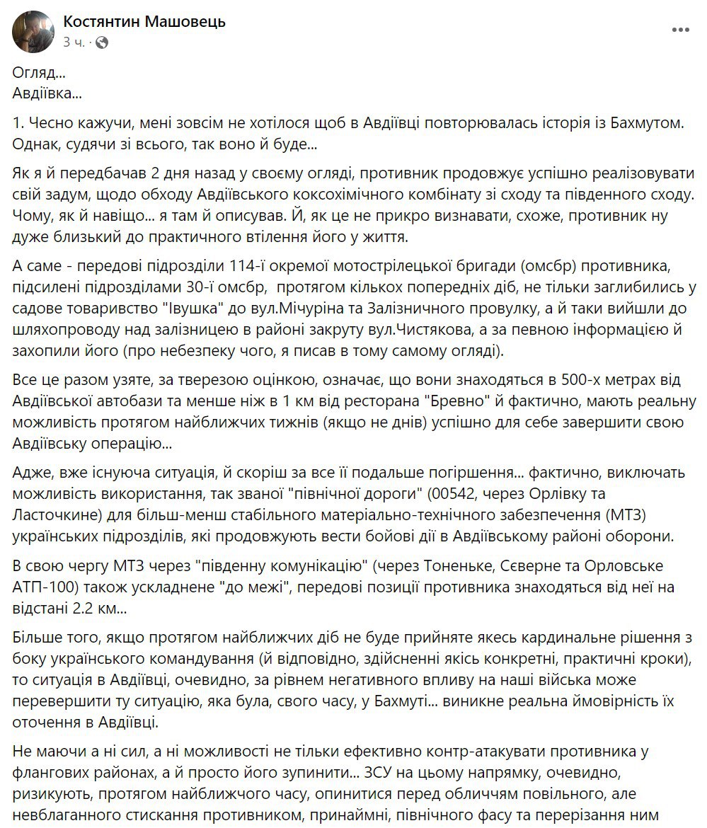 "Все это вместе взятое, по трезвой оценке, означает, что они находятся в 500-х метрах от Авдеевской автобазы и менее чем в 1 км от ресторана "Бревно" и фактически имеют реальную возможность в течение ближайших недель (если не дней) успешно для себя завершить свою Авдеевскую операцию", - пишет Машовец.