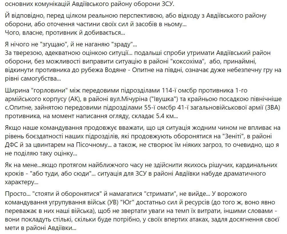 По его мнению, "противник продолжает успешно реализовывать свой замысел об обходе Авдеевского коксохимического комбината с востока и юго-востока".