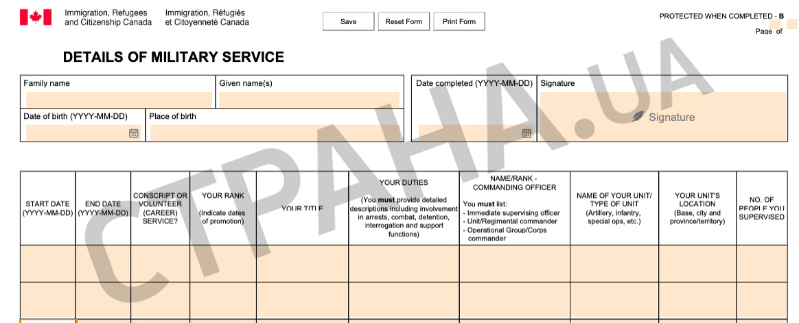 Форма с информацией о военной службе, которую требуют у украинских мужчин, подающихся на ВНЖ в Канаде