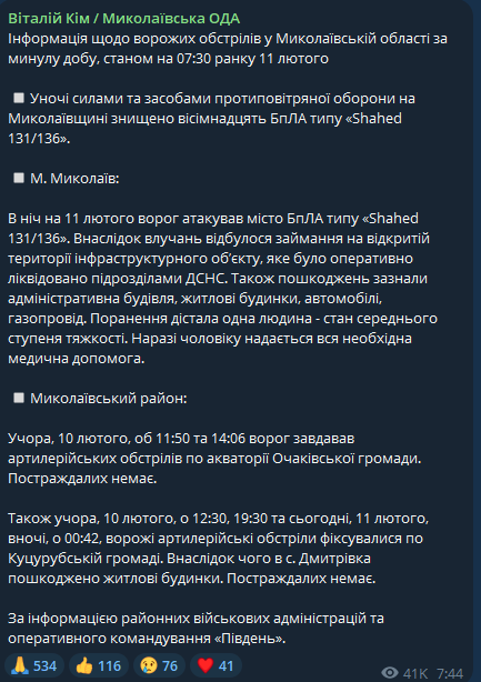 В ночь на 11 февраля российские военные атаковали Николаев "Шахедами". В результате попадания произошло возгорание на открытой территории инфраструктурного объекта, которое было оперативно ликвидировано подразделениями ГСЧС.