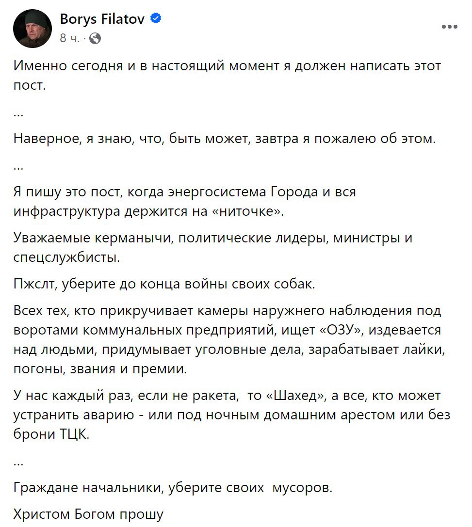 "Уважаемые керманычи, политические лидеры, министры и спецслужбисты. Пжслт, уберите до конца войны своих собак. Всех тех, кто прикручивает камеры наружного наблюдения под воротами коммунальных предприятий, ищет "ОЗУ", издевается над людьми, придумывает уголовные дела, зарабатывает лайки, погоны, звания и премии. У нас каждый раз, если не ракета, то "Шахед", а все, кто может устранить аварию - или под ночным домашним арестом или без брони ТЦК", - написал Филатов.