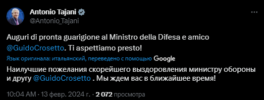 В ночь на вторник, 13 февраля министра обороны Италии Гвидо Крозетто госпитализировали.