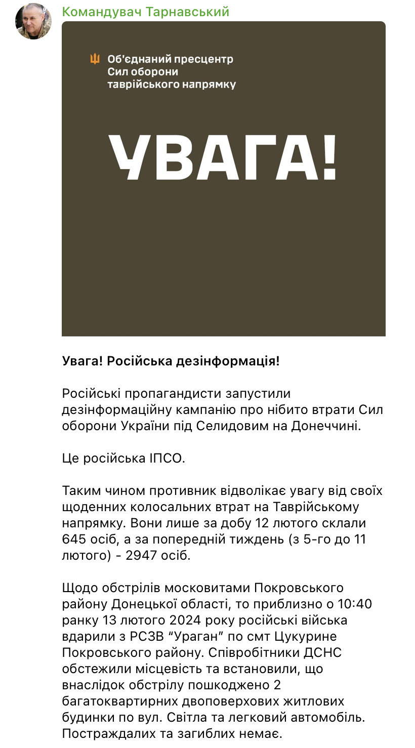 Позже генерал Александр Тарнавский опроверг заявления РФ, назвав их "российской ИПСО".