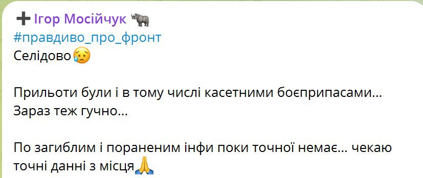 Из украинских источников об ударе по Селидово кассетными боеприпасами написал экс-нардеп Игорь Мосийчук, не уточняя, погиб ли кто-то из ВСУ.