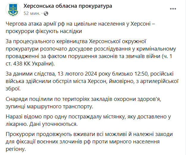 По данным следствия, 13 февраля 2024 около 12:50, российские войска обстреляли город Херсон, вероятно, из артиллерийского оружия.