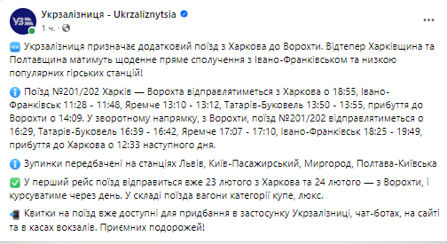 "Укрзализныця" запустит новый дополнительный маршрут поезда, который будет ездить из Харькова в Ворохту Ивано-Франковской области, а также в обратном направлении. В результате Харьковская и Полтавская области получат ежедневное прямое сообщение с Ивано-Франковском.