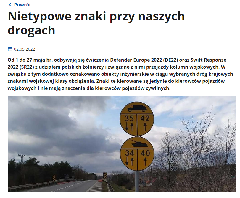 С 12 февраля в Польше стартовали международные военные учения под названиями "Стойкий защитник-24" и "Дракон-24" в связи с этим на дорогах стали устанавливать желтые знаки.