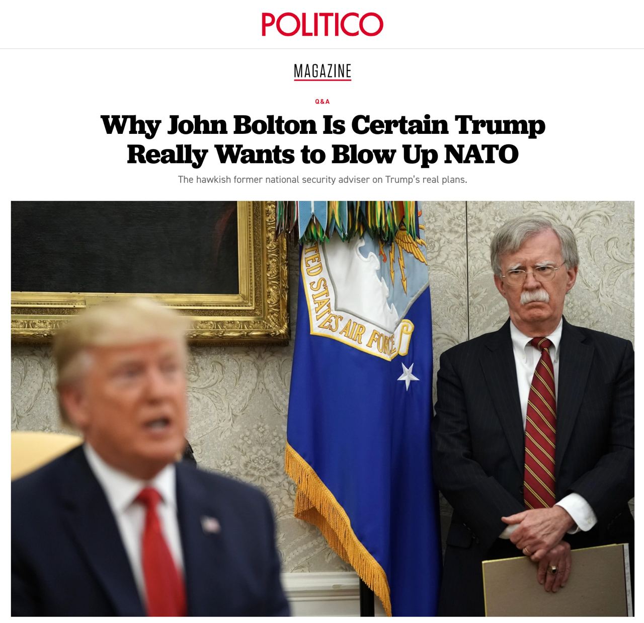 "Поэтому каждый из этих комментариев, как он делает их вот уже более шести лет, для меня просто подтверждает, что идея выхода из НАТО для него очень серьезна. Люди говорят: "Ну, он не совсем серьезен. Он ведет переговоры с НАТО". Послушайте, я был там, когда он почти вышел, и он не ведет переговоров, потому что его цель здесь не в укреплении НАТО, а в том, чтобы заложить основу для выхода", - считает Болтон.