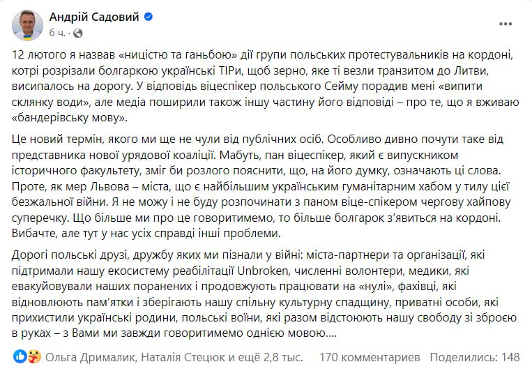 "Это новый термин ("бандеровский язык"), который мы еще не слышали от публичных лиц. Особенно удивительно услышать это от представителя новой правительственной коалиции… Я не могу и не буду начинать с господином вице-спикером очередной хайповый спор. Чем больше мы будем об этом говорить, тем больше болгарок (срезающих замки на фурах с зерном – Ред.) появится на границе", – заявил Садовой.