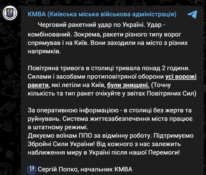 Воздушная тревога в Киеве длилась более двух часов. Силами и средствами ПВО все вражеские ракеты, летевшие на Киев, были уничтожены.