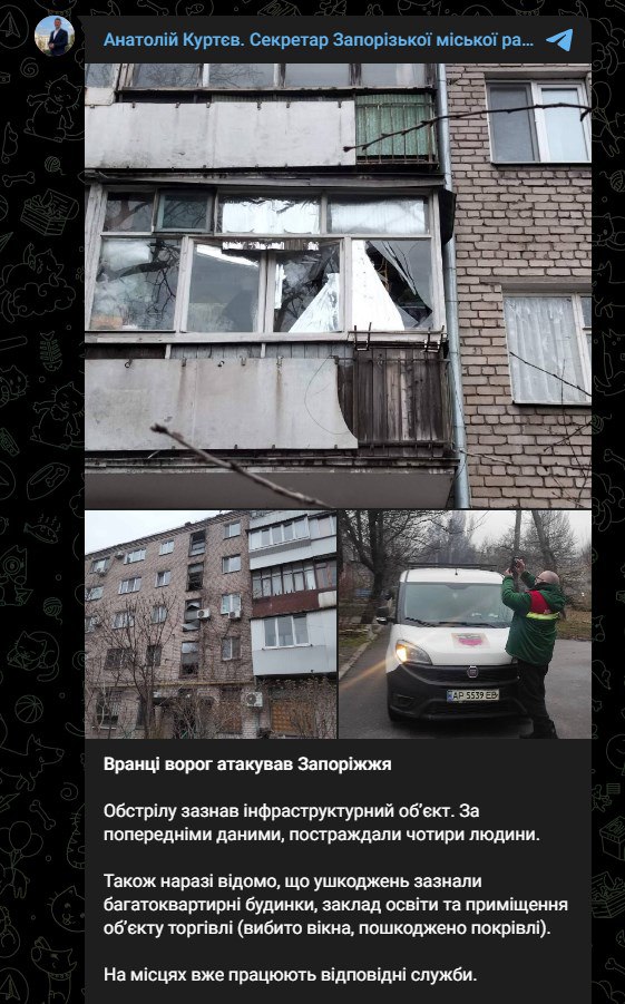 08.07 Утром в Запорожье под обстрел попал инфраструктурный объект. По предварительным данным, пострадали четыре человека.