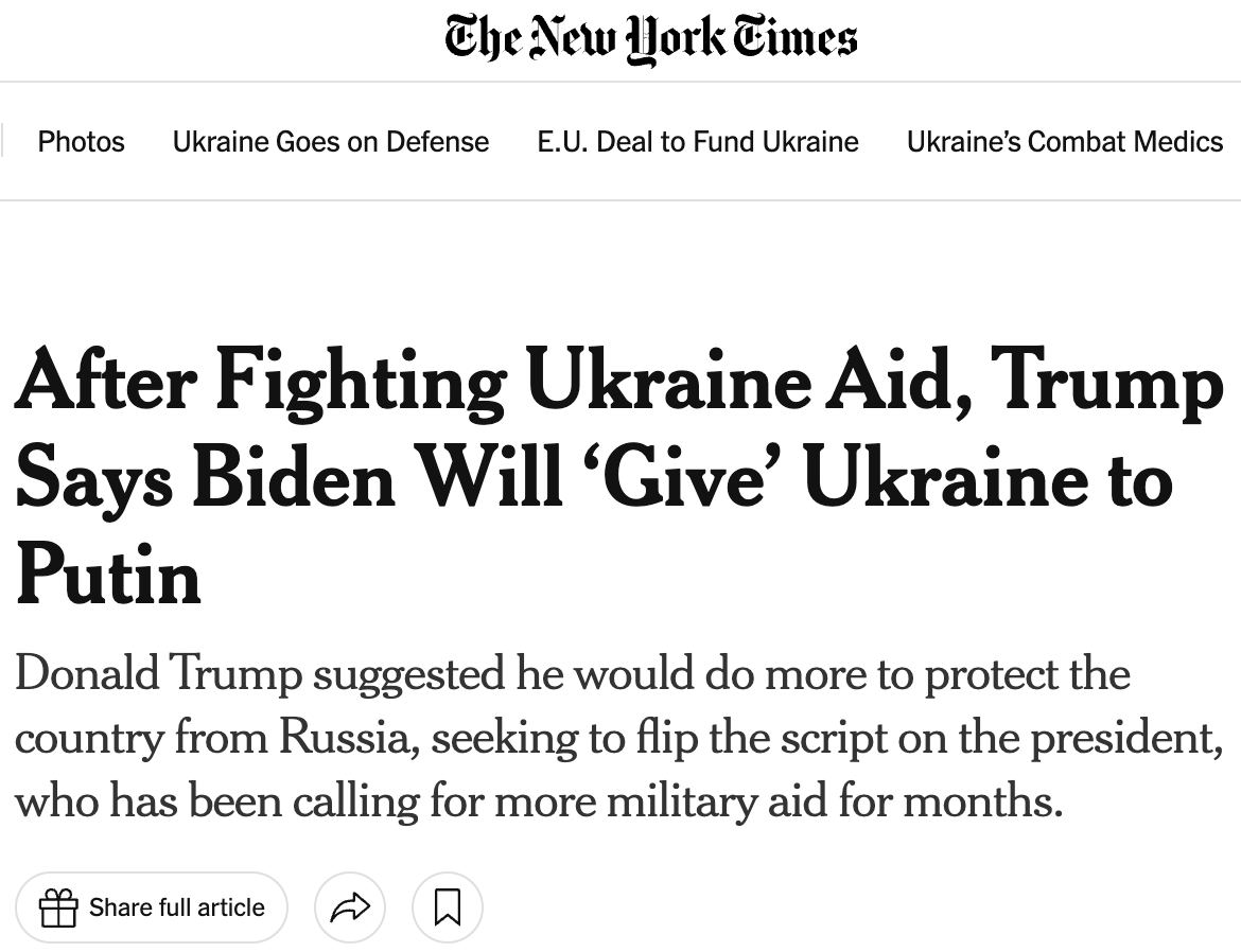 13.59 Трамп заявил, что Байден «собирается отдать» Украину Путину, а он - нет.