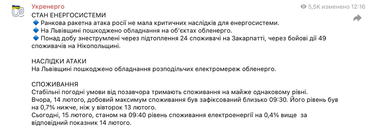 15.57 "Укрэнерго" заявляет, что утренняя ракетная атака РФ "не имела критических последствий для энергосистемы".