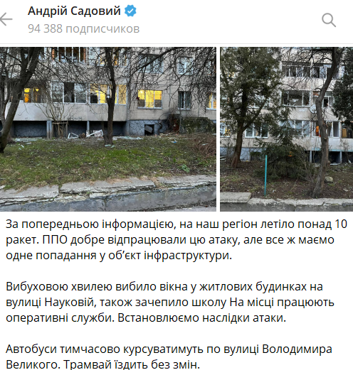 Последствия прилета во Львове. Фото: Telegram/andriysadovyi
