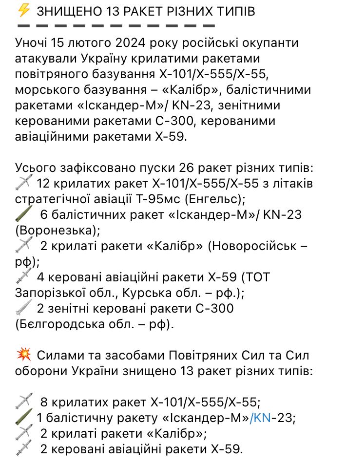 Ночью 15 февраля силы ПВО сбили 13 ракет из 26, выпущенных РФ по Украине.
