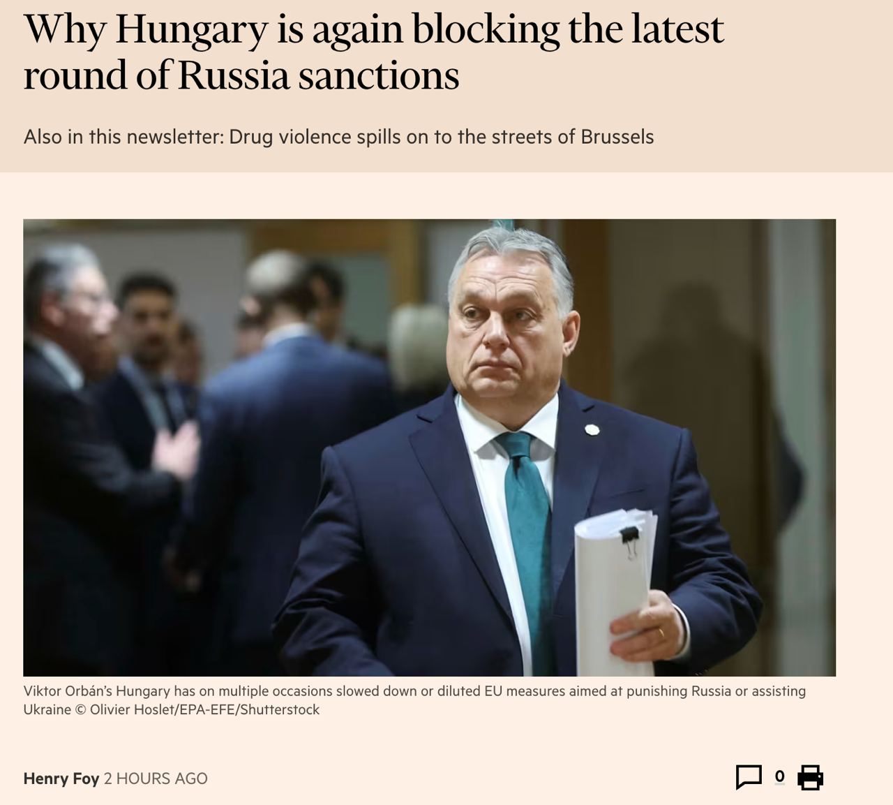 Венгрия заблокировала одобрение очередного пакета санкций ЕС против РФ - Financial Times