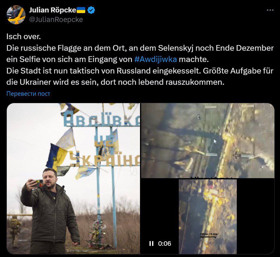"Российский флаг на месте, где Зеленский сделал селфи у въезда в Авдеевку в конце декабря. Сейчас город тактически окружен Россией. Самой большой задачей для украинцев будет выбраться оттуда живыми", - написал журналист.