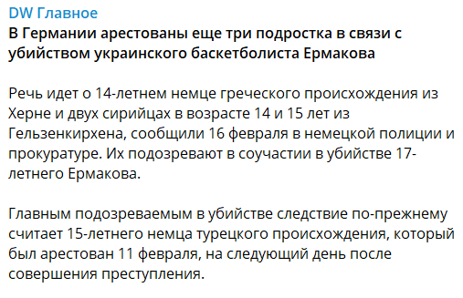 В Германии по делу об убийстве украинского баскетболиста арестованы три подростка.