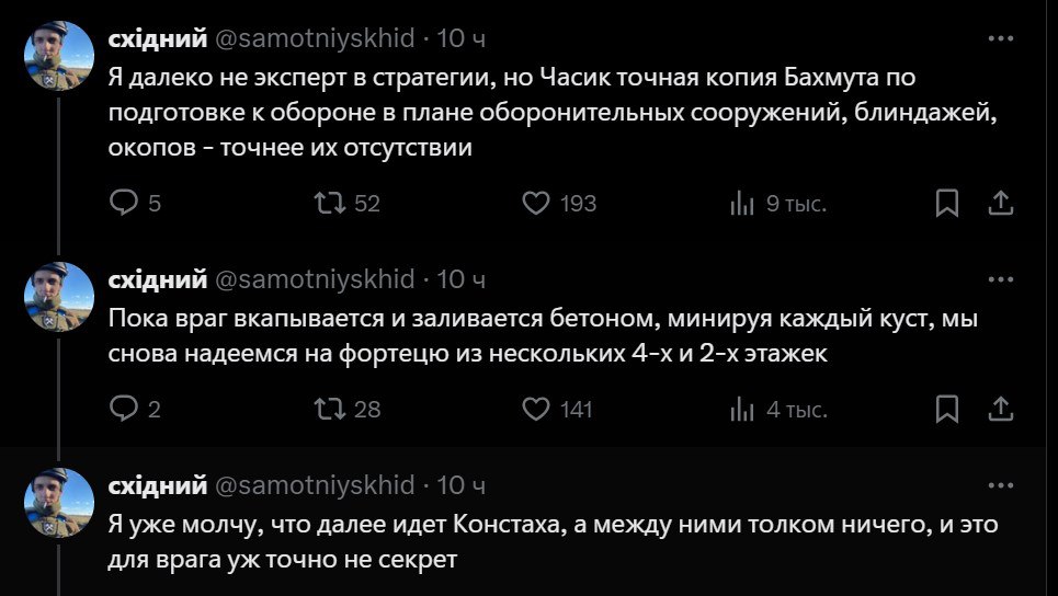 10:50 Украинский военный с позывным Східний, воюющий в Часов Яре, заявляет, что город плохо укреплен перед угрозой наступления РФ.