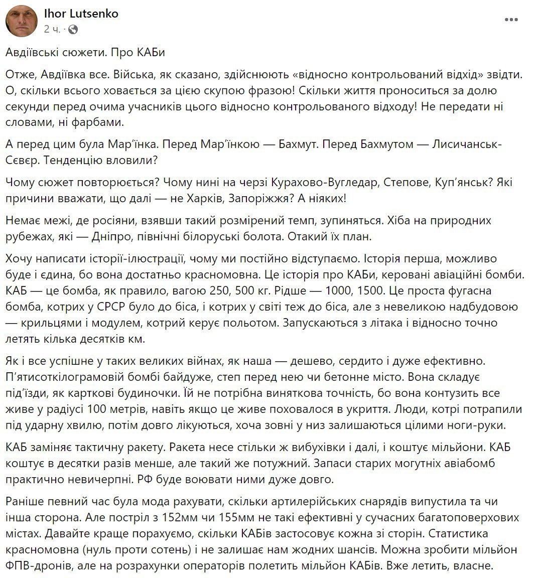 Одним из главных преимуществ россиян Луценко считает массированное применение управляемых авиабомб. По его словам, у РФ огромные запасы этих бомб, и с их помощью российская армия разбивает позиции ВСУ, вплоть до прицельных ударов по операторам дронов.
