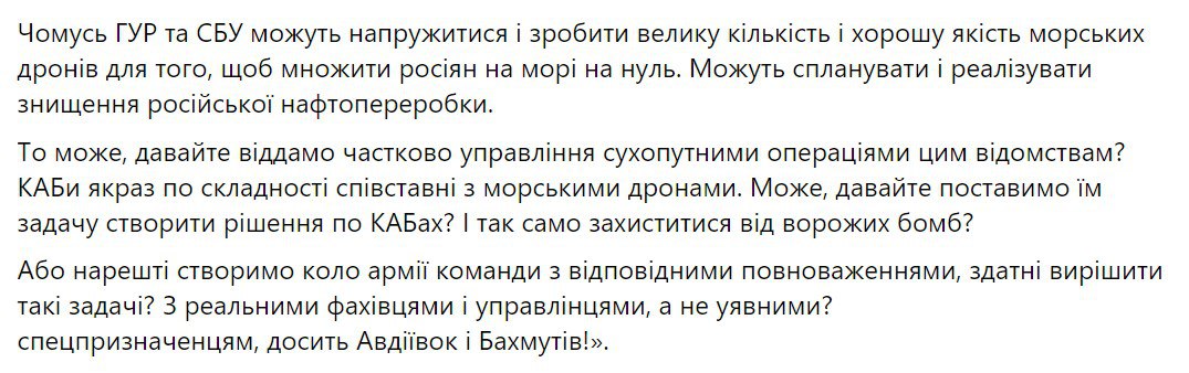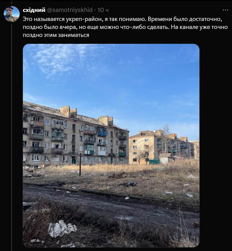 Пока враг вкапывается и заливается бетоном, минируя каждый куст, мы снова надеемся на фортецю из нескольких 4-х и 2-х этажек", - написал он в Х.