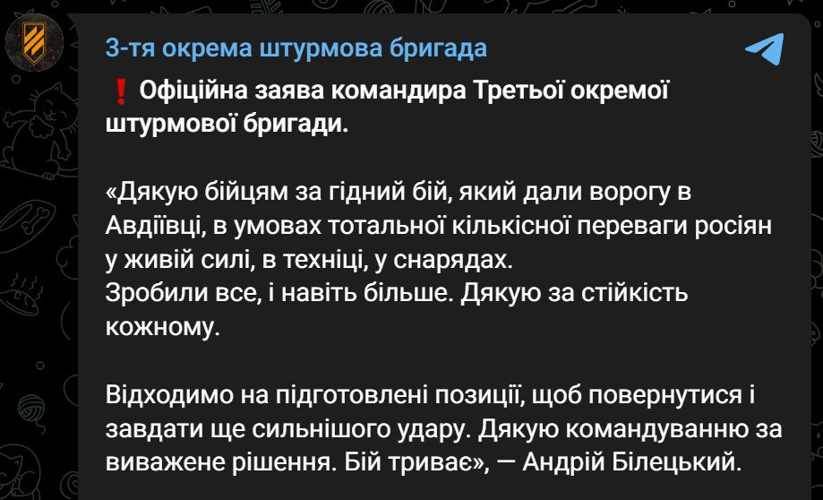 "Отходим на подготовленные позиции, чтобы вернуться и нанести еще более сильный удар. Благодарю командование за взвешенное решение. Бой продолжается", - заявил командир бригады Андрей Билецкий.