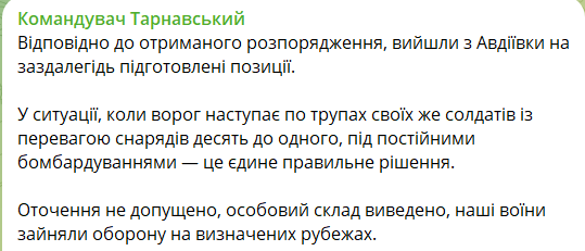 В свою очередь командующий группировкой "Таврия" Александр Тарнавский, как и ранее Сырский, заявил о выходе из всей Авдеевки.