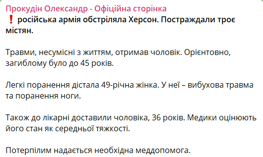 14:13 Сегодня днем российская армия обстреляла Херсон. Пострадали три человека. Об этом сообщает глава Херсонской ОВА Александр Прокудин.
