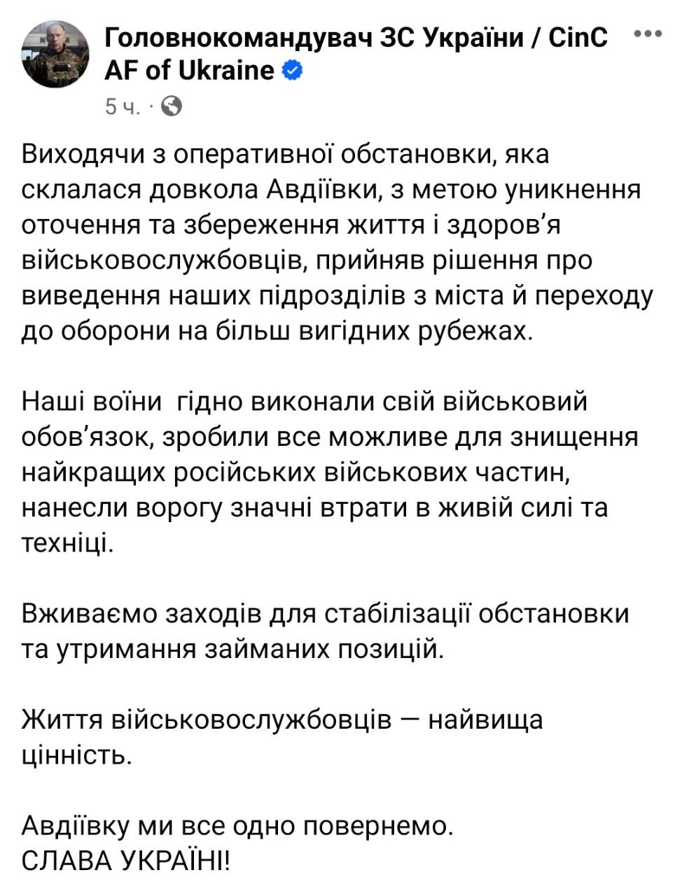 07:57 Главком ВСУ Александр Сырский заявил о выводе украинских войск из Авдеевки - с целью сохранения жизней солдат.