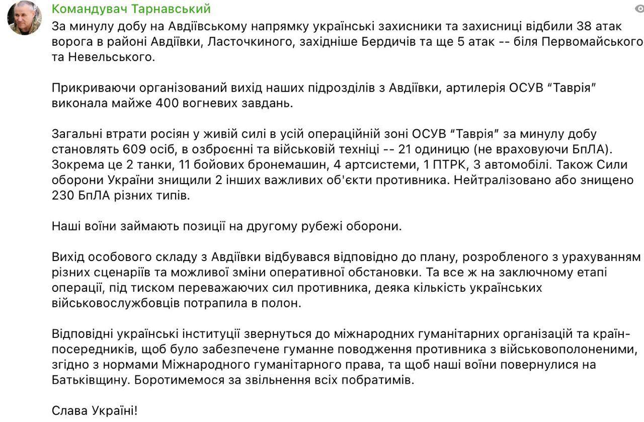 13:15 Командующий ОСУВ "Таврия" генерал Тарнавский заявил, что при выходе из Авдеевки, "под давлением превосходящих сил противника, некоторое количество украинских военнослужащих попало в плен".