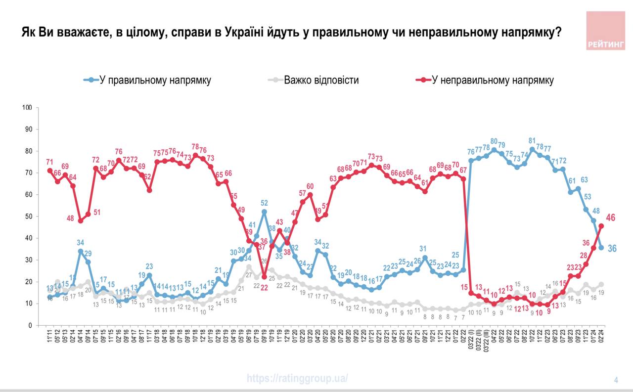 Число тех, кто считает, что Украина движется в неправильном направлении, впервые с начала войны превысило число тех, кто одобряет политику власти, причем сразу на 10%.