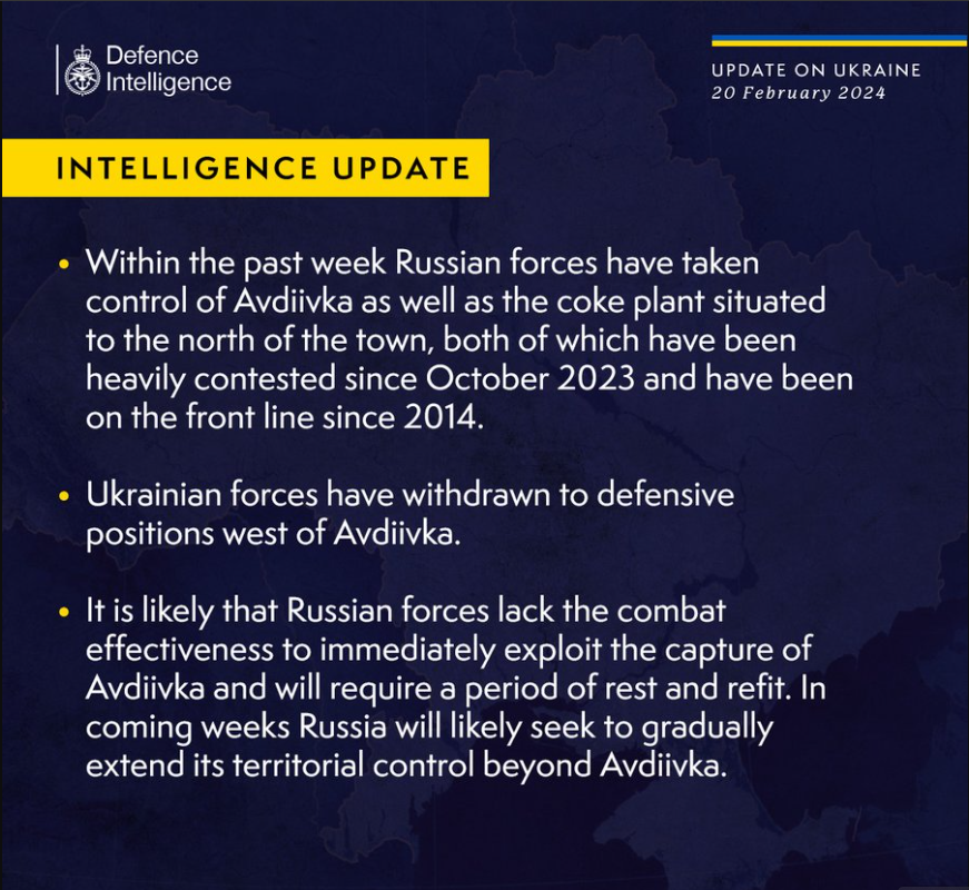 В британской разведке считают, что вероятно, что российским войскам не хватает боеспособности, чтобы немедленно воспользоваться захватом Авдеевки, и им потребуется период отдыха и перевооружения. После чего, Россия, вероятно, будет стремиться постепенно расширить свой территориальный контроль за пределы Авдеевки.
