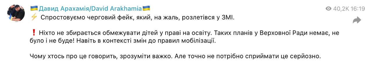 "Никто не собирается ограничивать детей в праве на образование. Таких планов у Верховной Рады нет, не было и не будет! Даже в контексте изменений в правилах мобилизации. Почему кто-то об этом говорит, понять трудно. Но точно не нужно воспринимать это всерьез", - написал Арахамия в телеграм-канале.