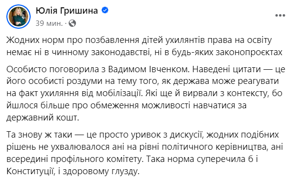 В ответ на это председатель подкомитета по вопросам высшего образования комитета Верховной Рады Украины по вопросам образования, науки и инноваций Юлия Гришина заявила, что никаких норм о лишении детей уклонистов права на образование нет.