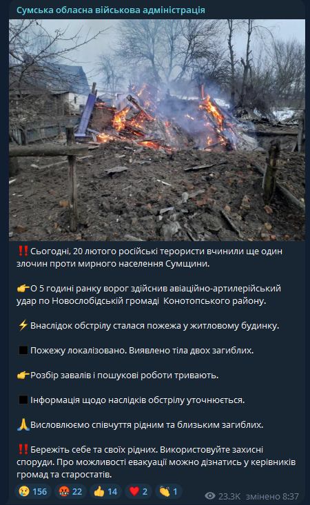 "В 5 часов утра враг нанес авиационно-артиллерийский удар по Новослободской общине Конотопского района. В результате обстрела произошел пожар в жилом доме" - сообщает ОВА.