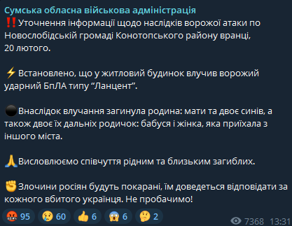Сегодня утром в Сумской области в результате прилета "Ланцета" в жилой дом погибла семья.