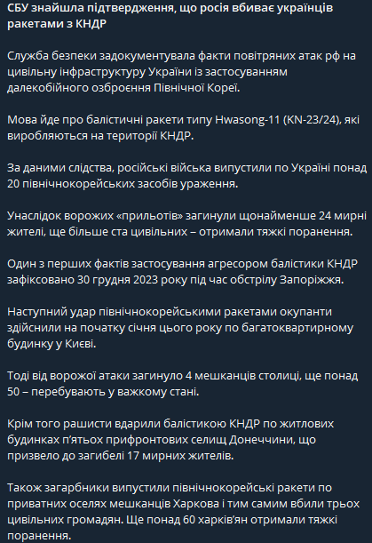 По данным следствия, российские военные использовали более 20 северокорейских оружейных систем против Украины. Служба безопасности Украины подчеркнула, что как минимум 24 мирных жителя погибли и более ста граждан получили тяжелые ранения в результате атак.