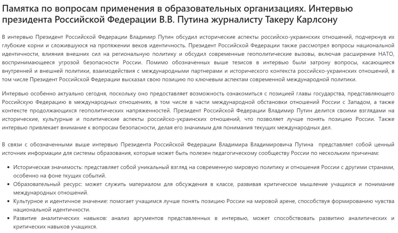 Министерство образования РФ рекомендует учебным заведениям использовать интервью главы Кремля Владимира Путина американскому журналисту Такеру Карлсону как "образовательный ресурс".