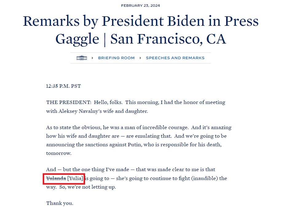 Его слова опубликованы в сообщении на сайте Белого дома. В публикации произнесенное президентом США имя Иоланда зачеркнуто, в скобках написан верный вариант: Юлия.