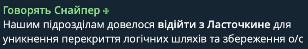 21.22 Украинский военный паблик DeepState подтвердил захват россиянами села Ласточкино к западу от Авдеевки, о чем ранее сообщали военные ВСУ и российские телеграмм-каналы.